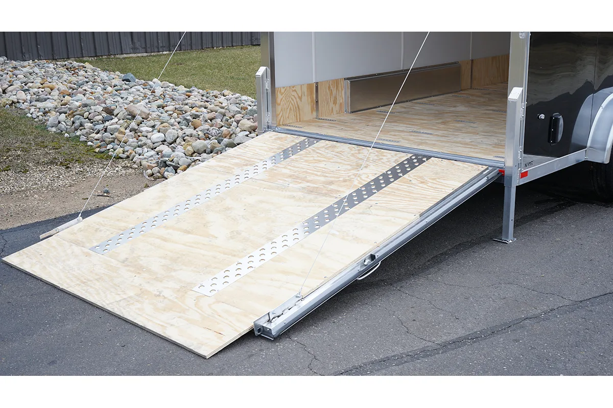 The ProFlap was designed by the Engineers at NEO and is a popular option for a ramp door. You can see in the picture that there is no piano hinge on the ramp. This creates a clear, smooth path for loading and unloading. It especially makes a difference when transporting snowmobiles.